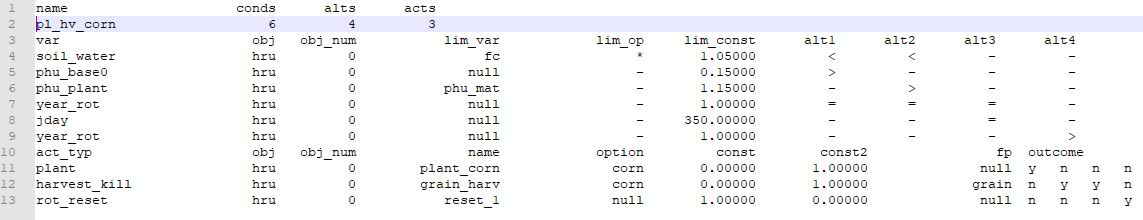 plant corn based on heat units: if soil water < 1.50*fc and if phubase0 > 0.15*phu_mat and if year_rot = 1 then check outcomes for ‘y’ and if ‘y’, take that action (plant)